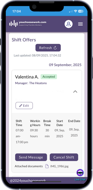 youchoosework will email the setting an invoice on the Monday after the completed shift, this is to be paid within 48 hours.